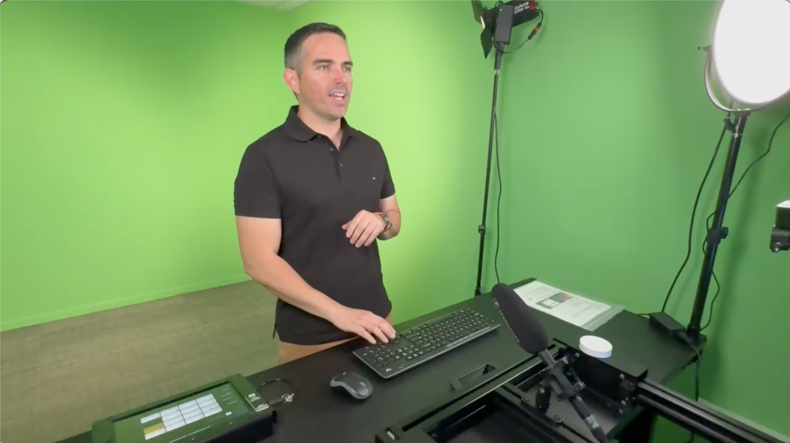 Es un estudio completamente equipado con cámara, luces, fondo verde, micrófono, teleprompter y computador. Permite grabar de forma autónoma y sin muchos conocimientos, manejando todo de forma intuitiva desde un iPad con la app MixEffect Pro.